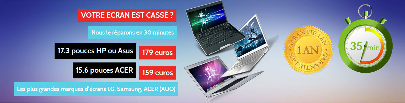 Nous avons plus de 100 références d’écrans et plus de 300 pièces en stocks. Ce qui nous permet de réparer votre portable en de très brefs délais