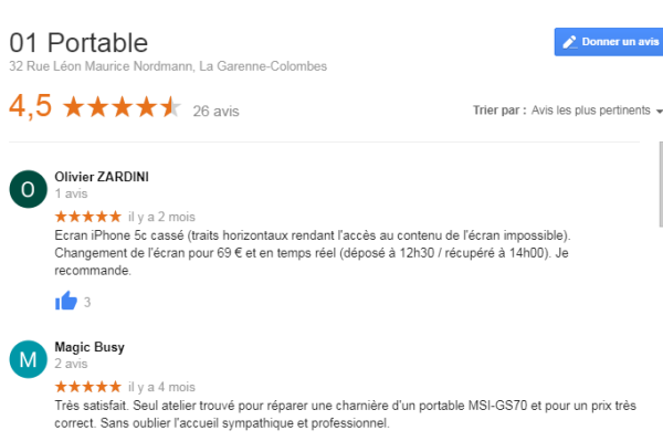 10h00-18h00 Lun-Sam, 32 rue Léon Maurice Nordmann, 92250 La Garenne Colombes Tel: 01 56 83 25 67 Email: contact@01-portable.fr